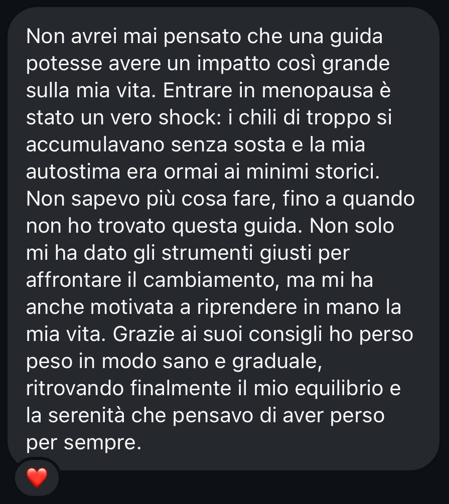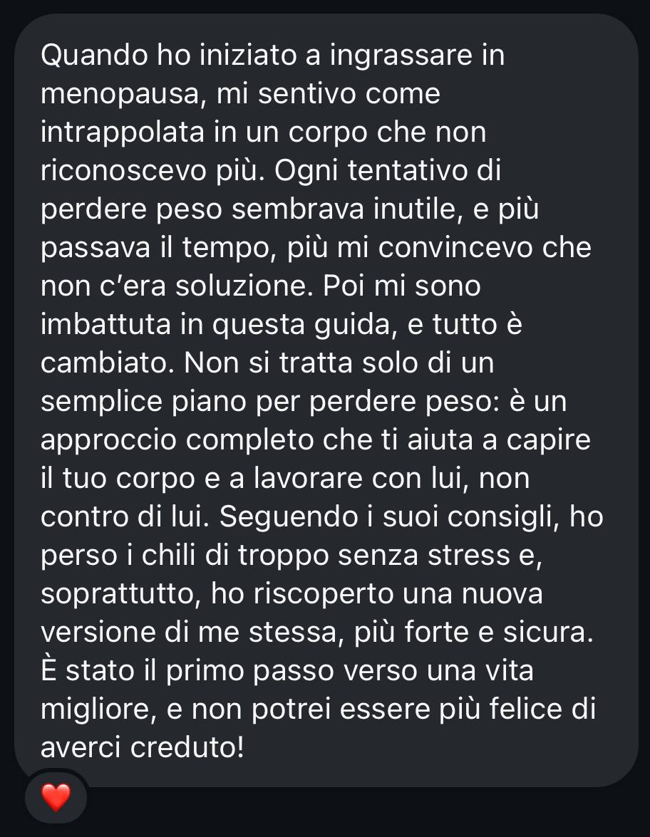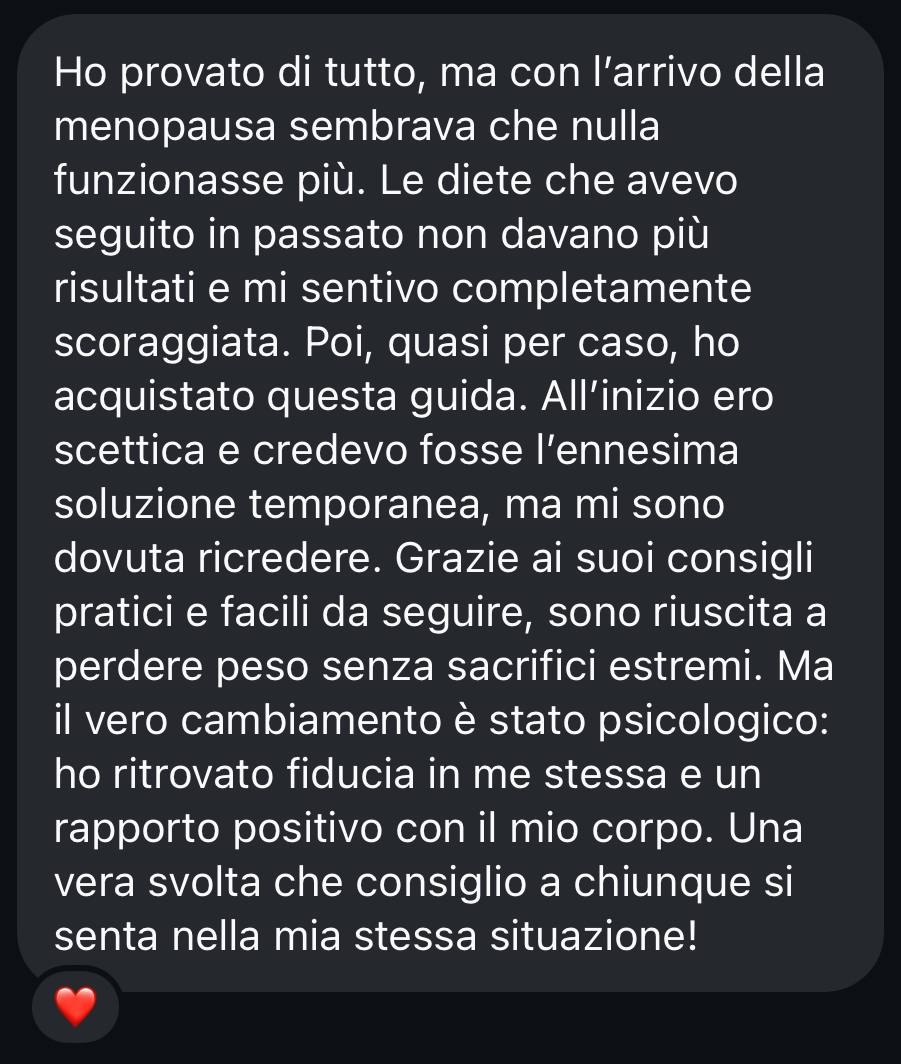 Questo manuale è PERFETTO per te, perché contiene al suo interno la miglior strategia per riattivare il metabolismo e perdere peso velocemente anche in menopausa e lo sappiamo perché lo abbiamo testato su tantissime donne differenti l’una dall’altra.